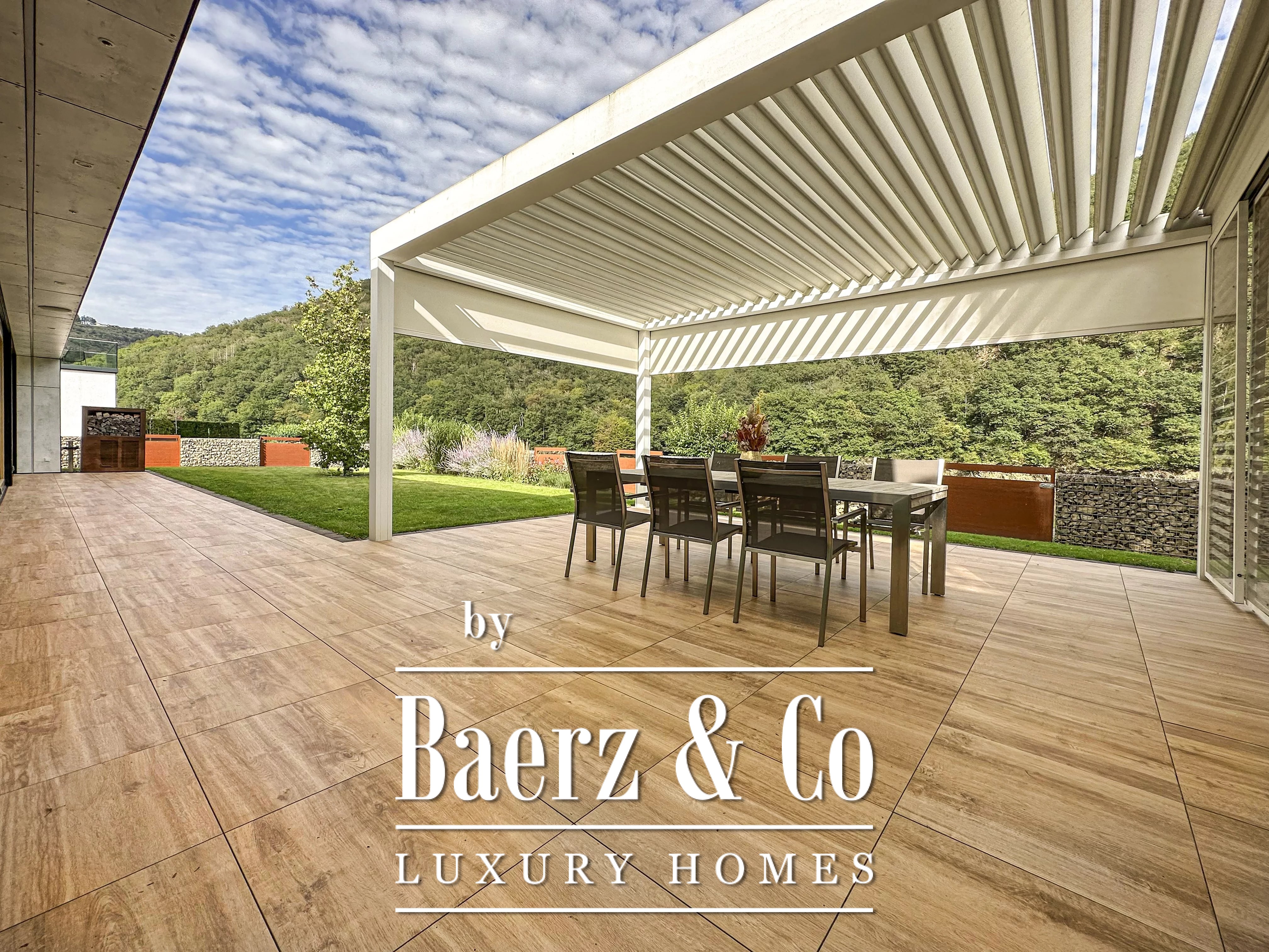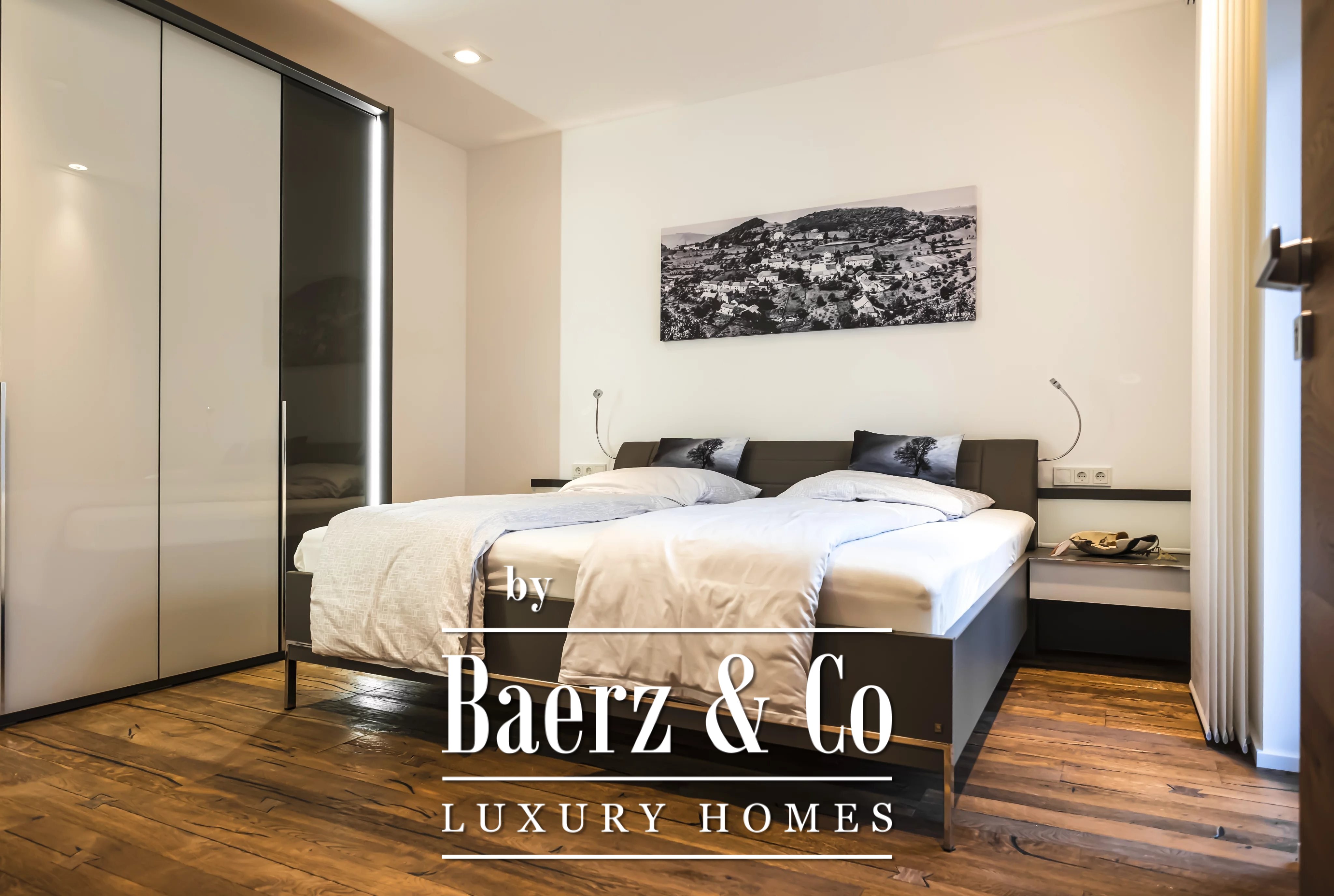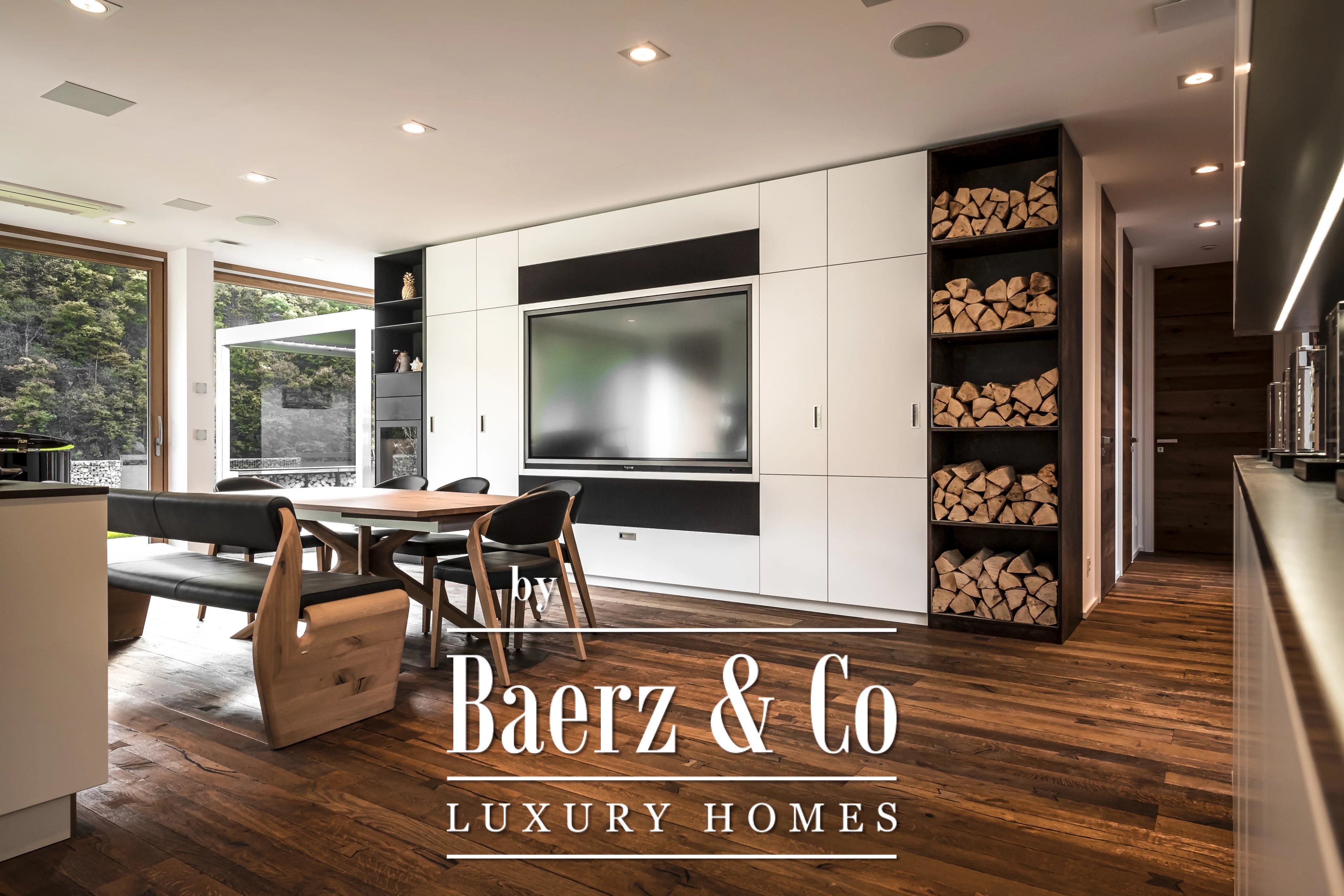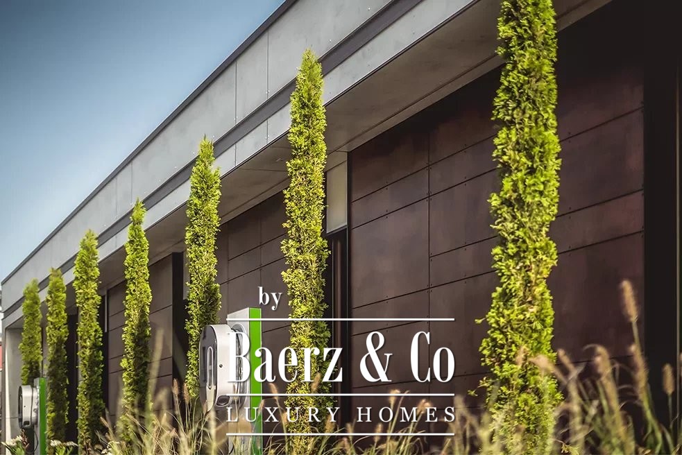 В интерьере акцент сделан на комфорт и точность. Резиденция полностью меблирована и оснащена бытовой техникой высокого класса, включая холодильник, посудомоечную машину, духовой шкаф и микроволновую печь. Такие детали, как тройное остекление, умный термостат, электрические жалюзи и продвинутая система автоматизации, придают дому тихую эффективность. Кондиционер и приточно-вытяжная вентиляция поддерживают оптимальный микроклимат, а оптоволоконный интернет и видеодомофон обеспечивают современный комфорт.