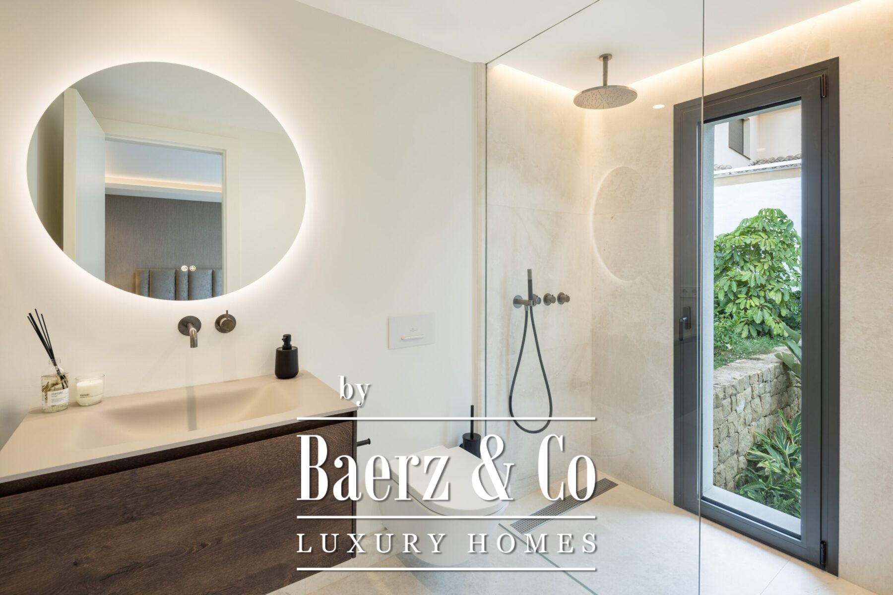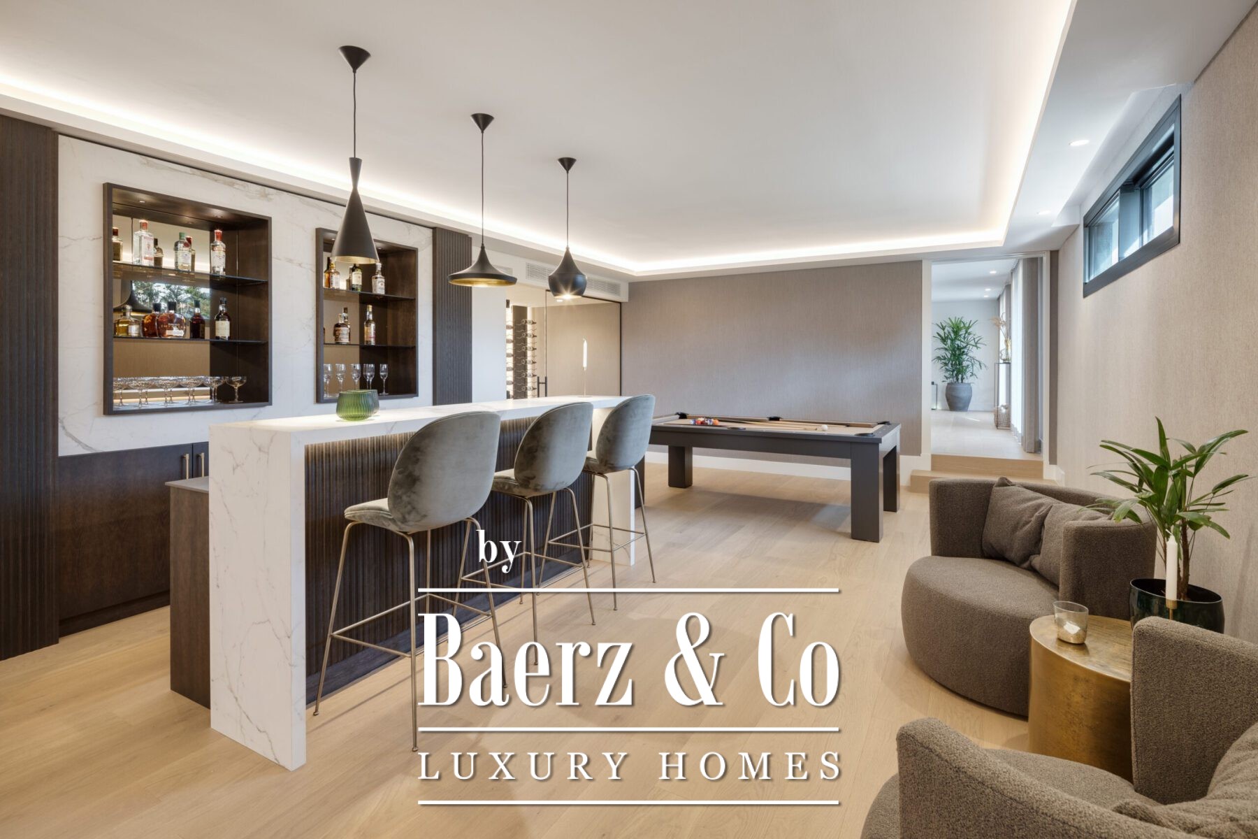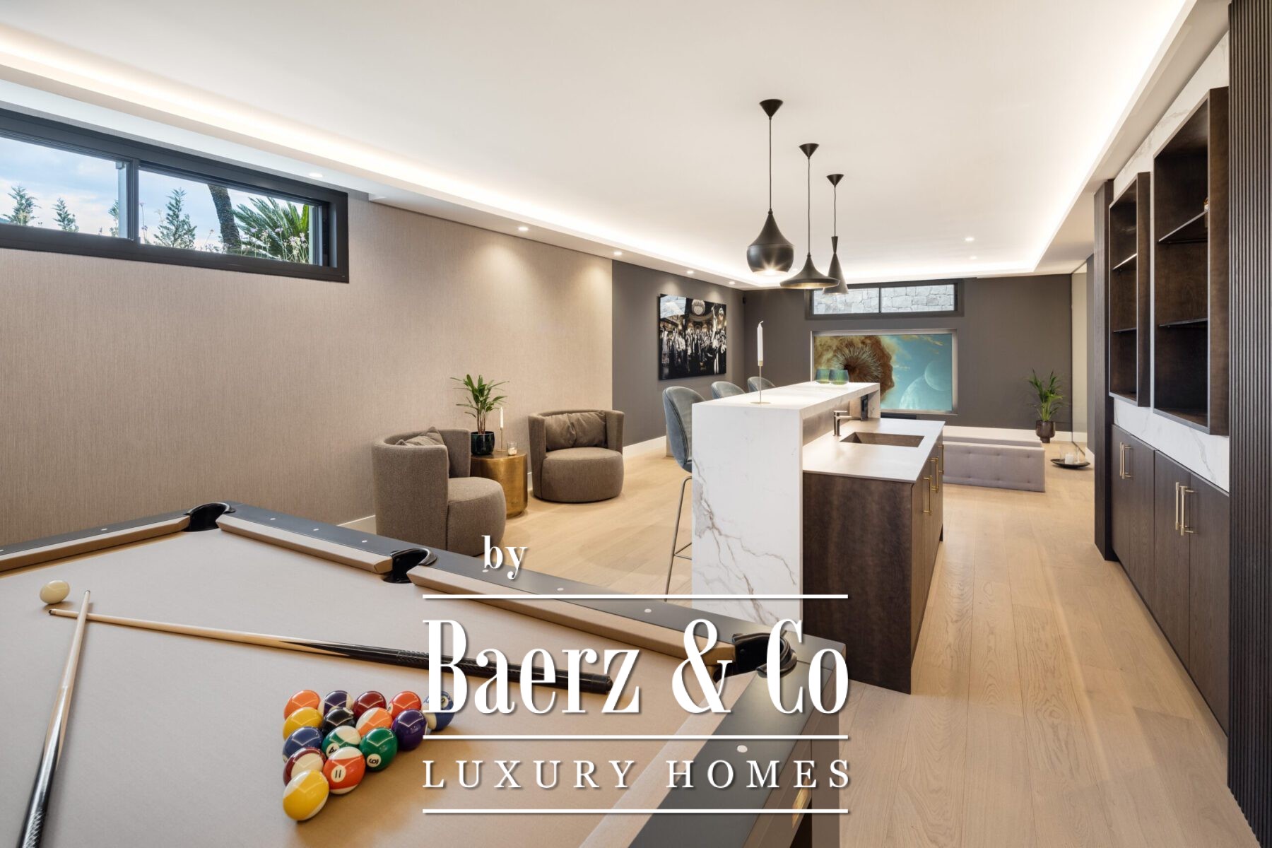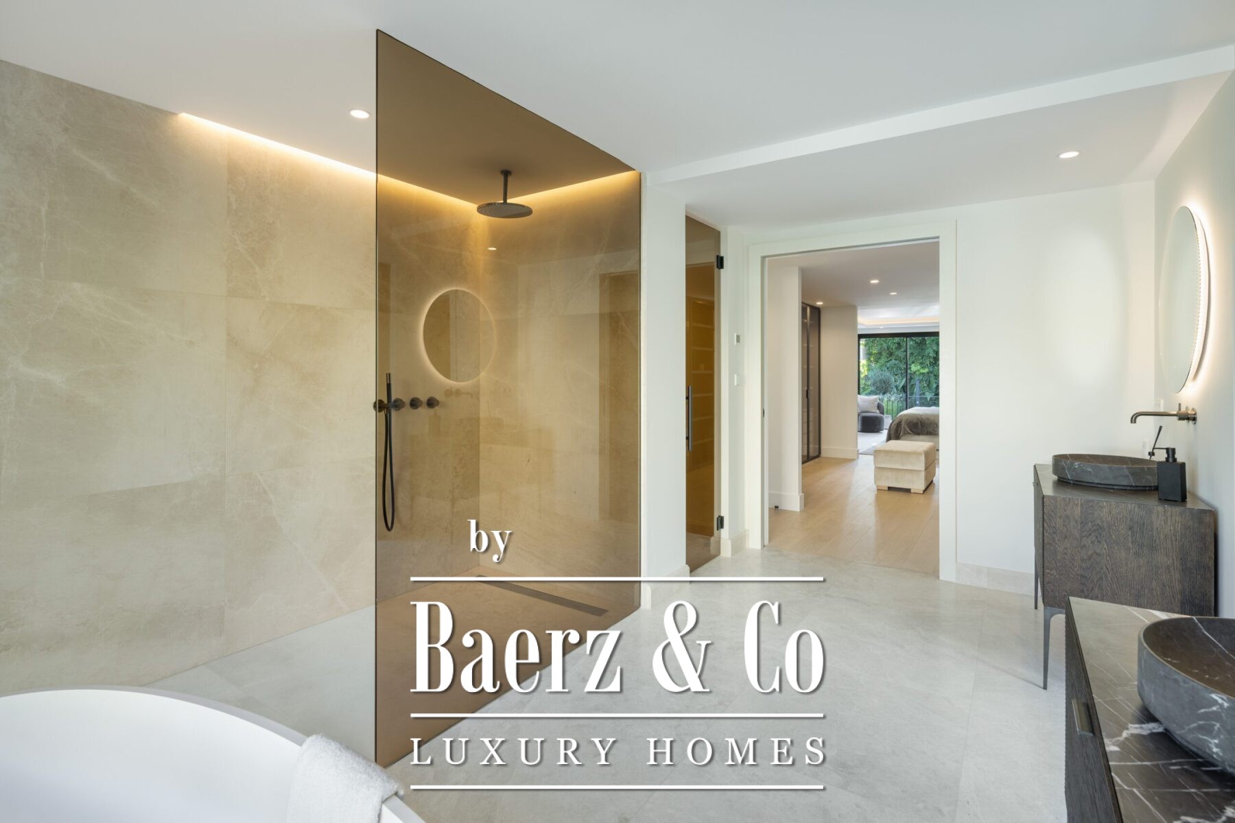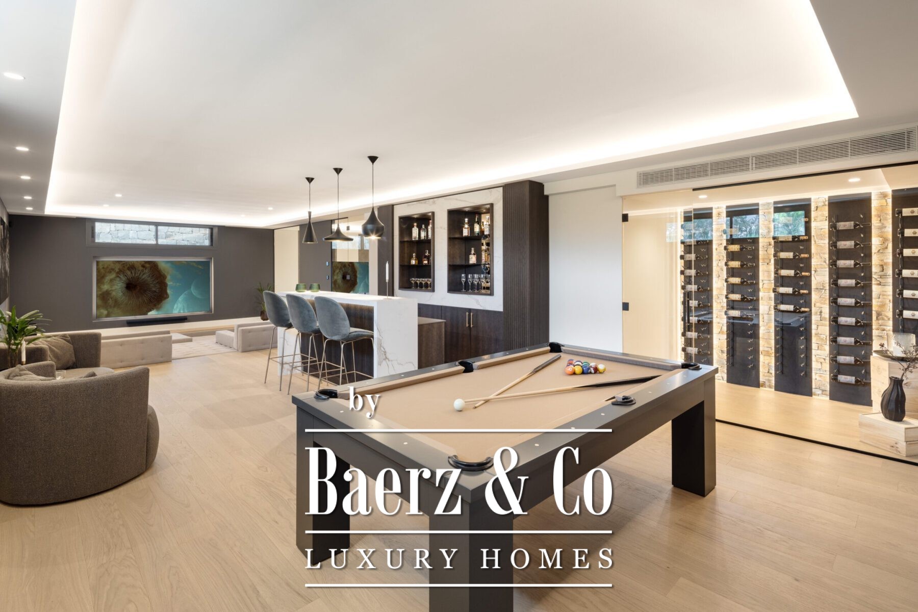 Каждая комната отличается продуманной планировкой и наполнена естественным светом, а паркет из дуба и премиальная техника Siemens усиливают утонченное тактильное восприятие. Первый этаж объединяет просторную кухню с обеденной зоной и гостиной, органично связывая внутреннее пространство с террасами. Отдельный гостевой апартамент с ванной комнатой обеспечивает приватность, а дополнительный гостевой санузел добавляет комфорта. На пол-уровня ниже находятся еще две спальни с ванными комнатами, что особенно удобно для приема семьи и друзей. Мастер-апартамент занимает приватный полуэтаж и оснащен гардеробной, двойной ванной, а также имеет прямой выход к бассейну и отдельный душ на открытом воздухе для создании атмосферы уединения.