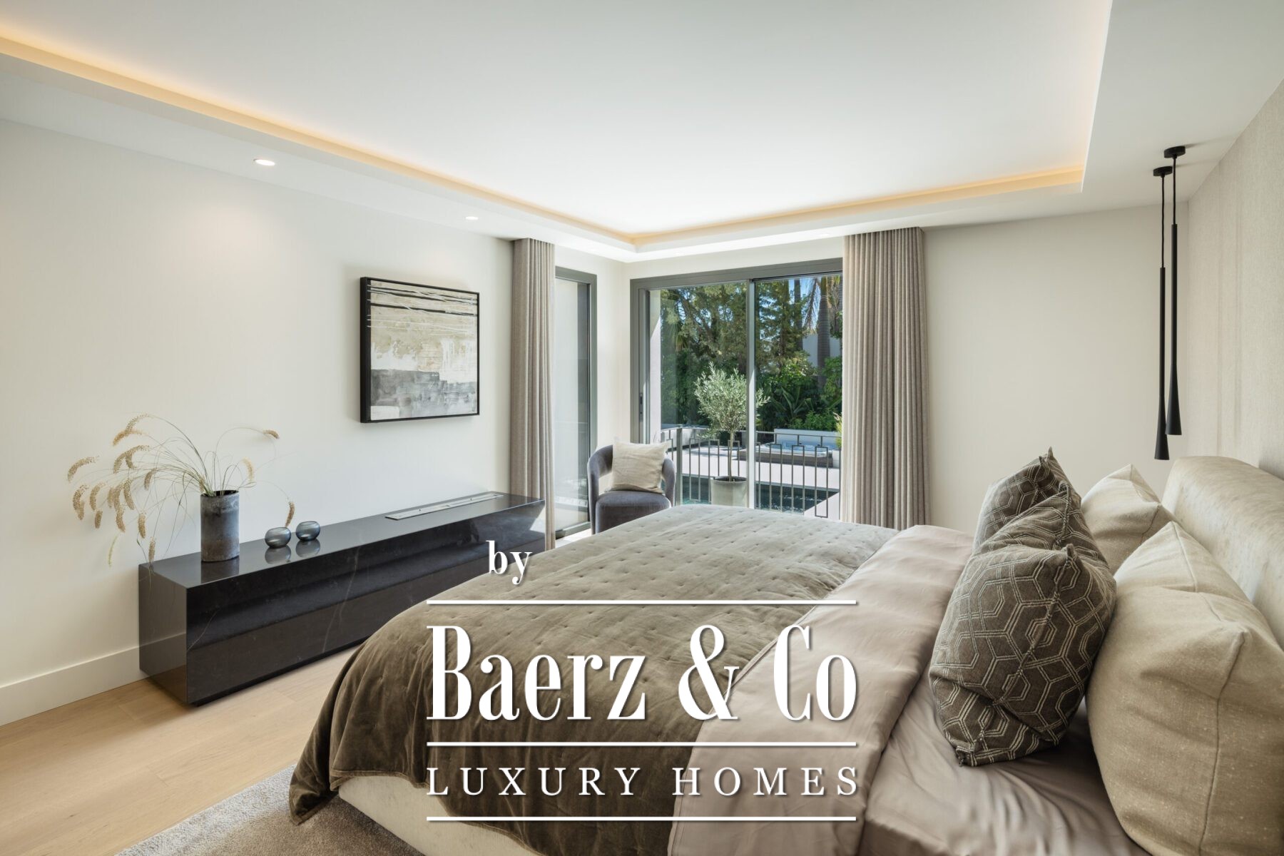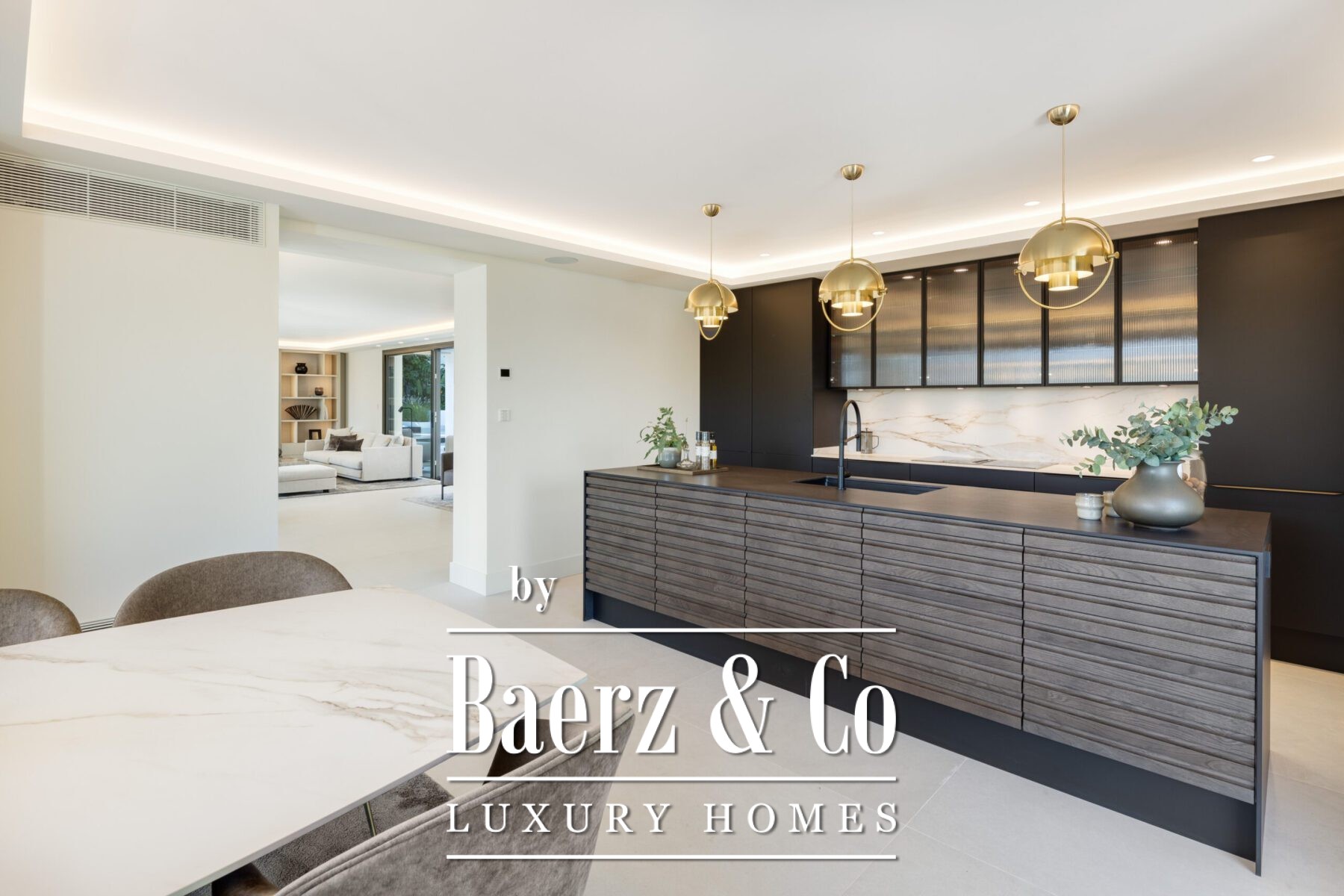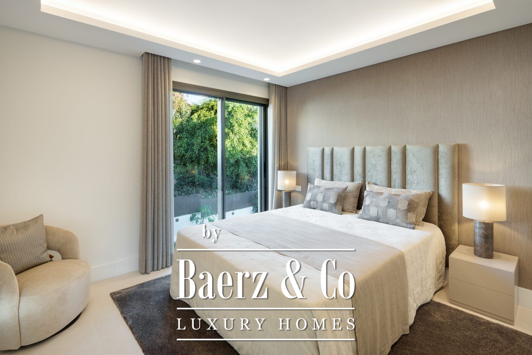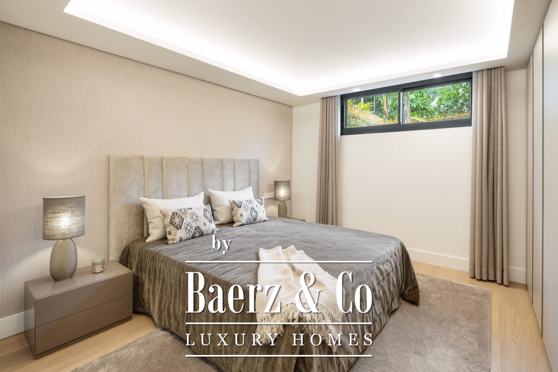 Каждая комната отличается продуманной планировкой и наполнена естественным светом, а паркет из дуба и премиальная техника Siemens усиливают утонченное тактильное восприятие. Первый этаж объединяет просторную кухню с обеденной зоной и гостиной, органично связывая внутреннее пространство с террасами. Отдельный гостевой апартамент с ванной комнатой обеспечивает приватность, а дополнительный гостевой санузел добавляет комфорта. На пол-уровня ниже находятся еще две спальни с ванными комнатами, что особенно удобно для приема семьи и друзей. Мастер-апартамент занимает приватный полуэтаж и оснащен гардеробной, двойной ванной, а также имеет прямой выход к бассейну и отдельный душ на открытом воздухе для создании атмосферы уединения.