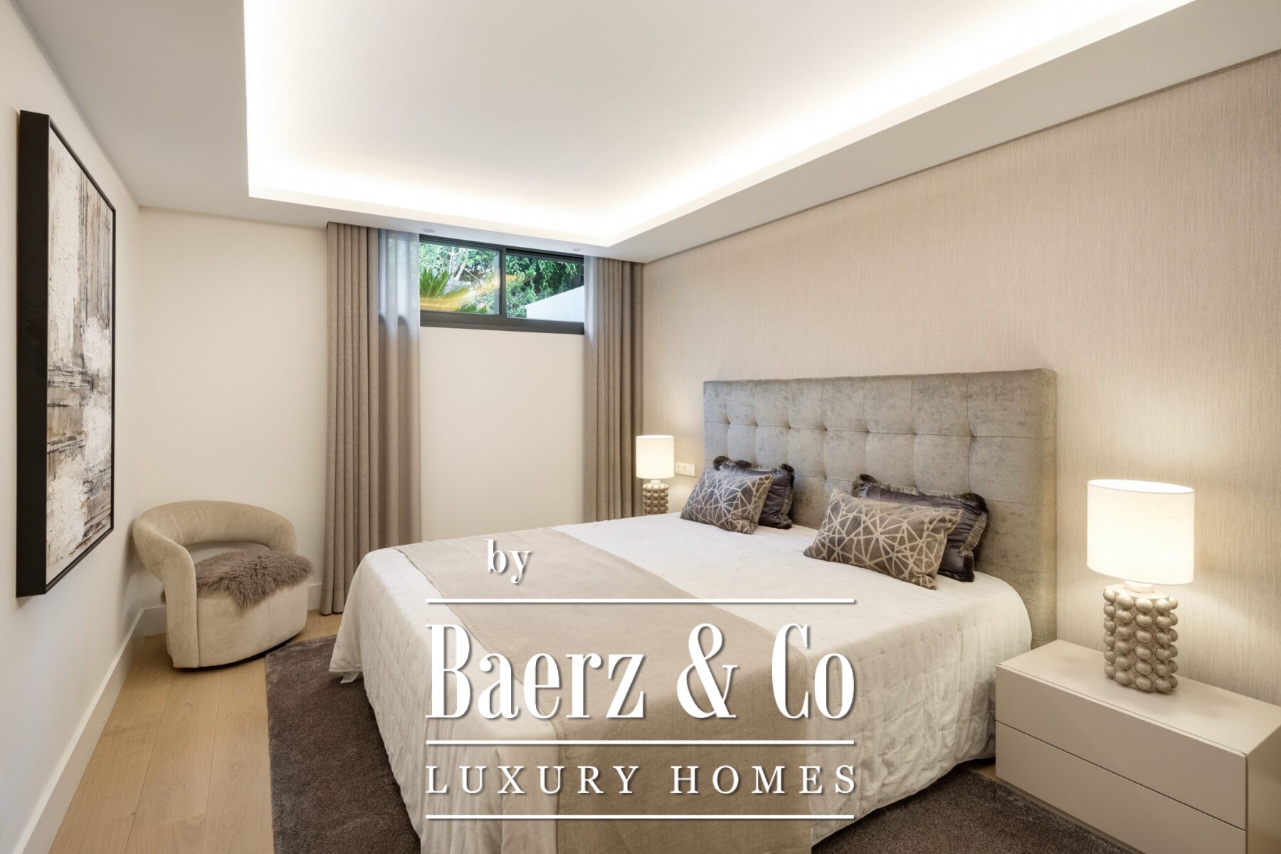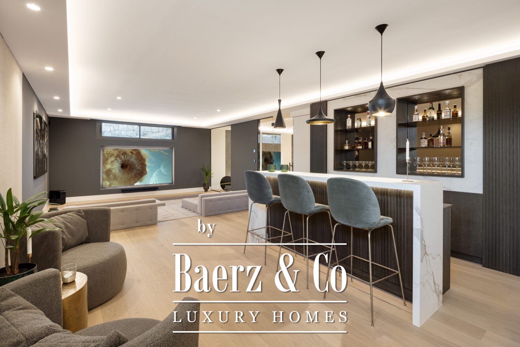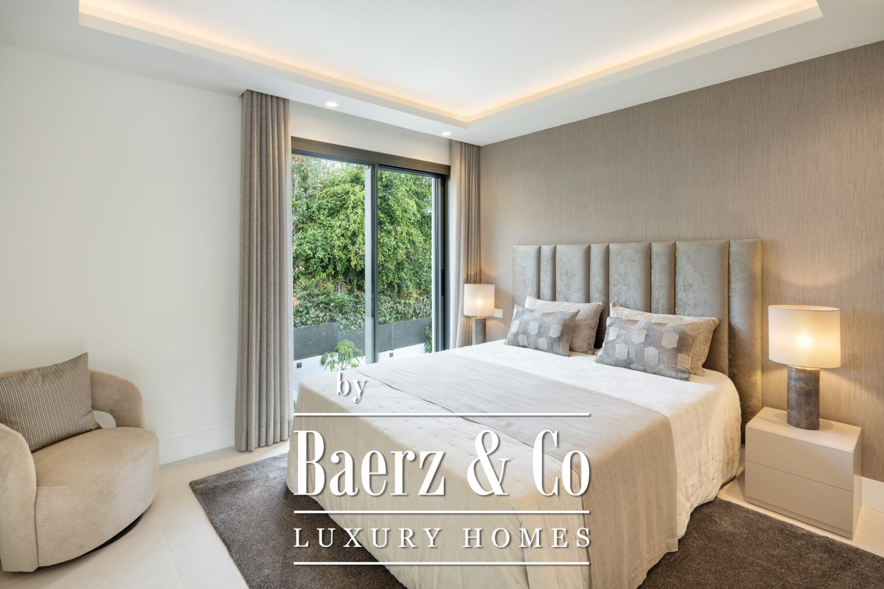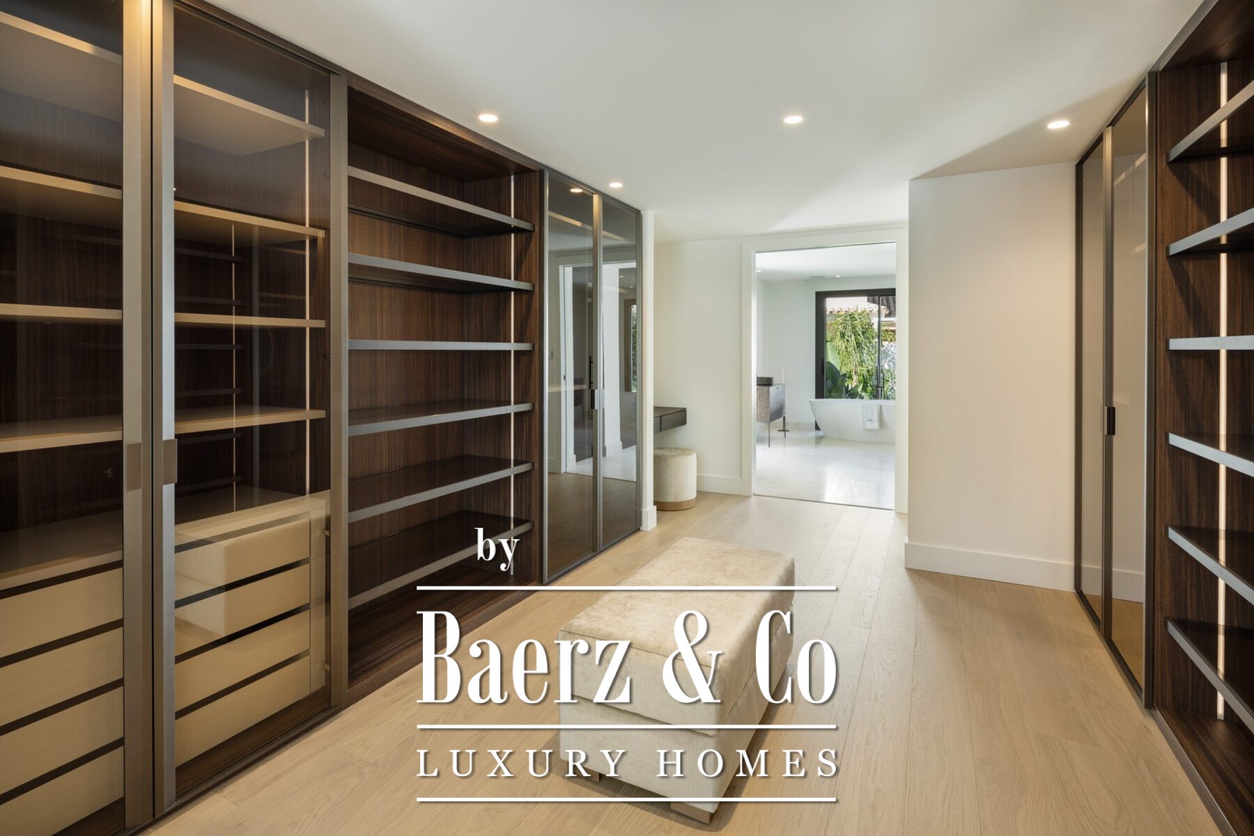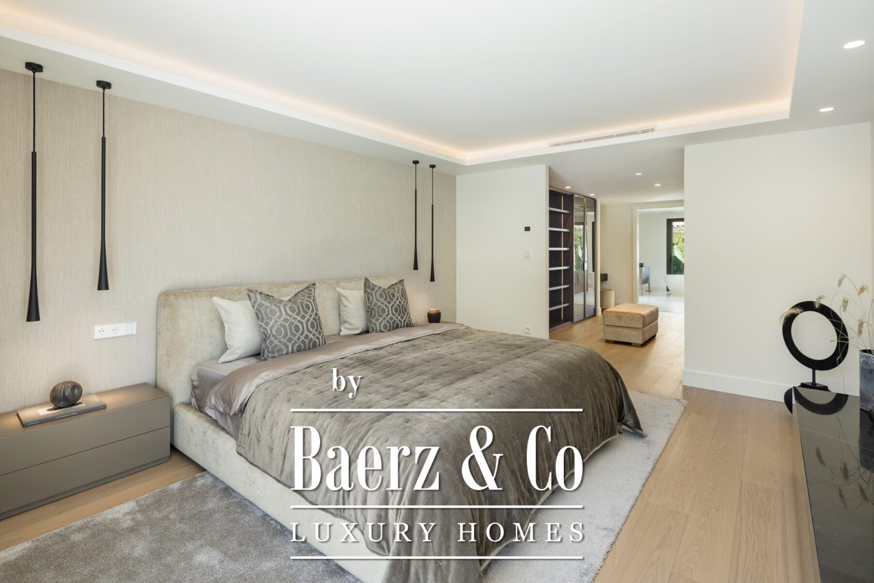 Каждая комната отличается продуманной планировкой и наполнена естественным светом, а паркет из дуба и премиальная техника Siemens усиливают утонченное тактильное восприятие. Первый этаж объединяет просторную кухню с обеденной зоной и гостиной, органично связывая внутреннее пространство с террасами. Отдельный гостевой апартамент с ванной комнатой обеспечивает приватность, а дополнительный гостевой санузел добавляет комфорта. На пол-уровня ниже находятся еще две спальни с ванными комнатами, что особенно удобно для приема семьи и друзей. Мастер-апартамент занимает приватный полуэтаж и оснащен гардеробной, двойной ванной, а также имеет прямой выход к бассейну и отдельный душ на открытом воздухе для создании атмосферы уединения.