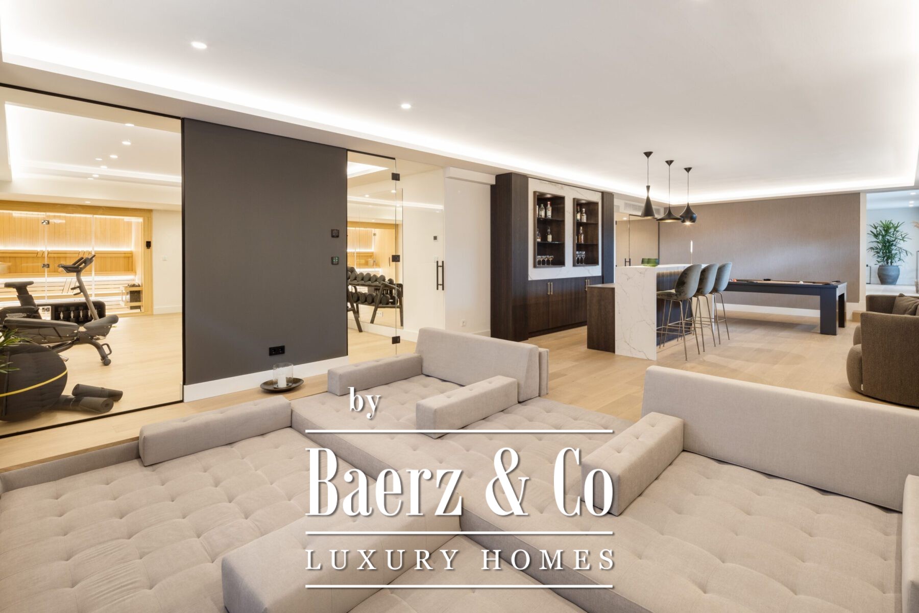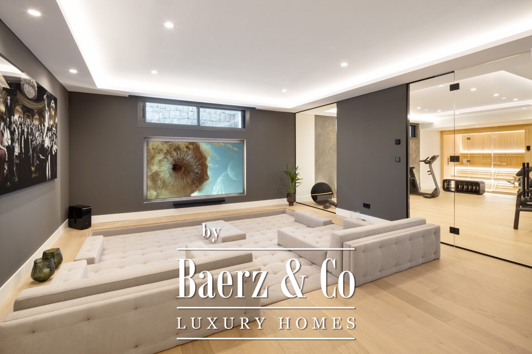 Социальный этаж ниже воплощает дух безмятежности и развлечений: бар, домашний кинотеатр, бильярдный стол, винный погреб, тренажерный зал, сауна и еще один гостевой апартамент. Жизнь на свежем воздухе обогащают многочисленные террасы, уединённый сад и солнечная лаунж-зона у бассейна. Подогреваемый соляной бассейн ориентирован к морю и горам, отражая исключительное положение виллы.