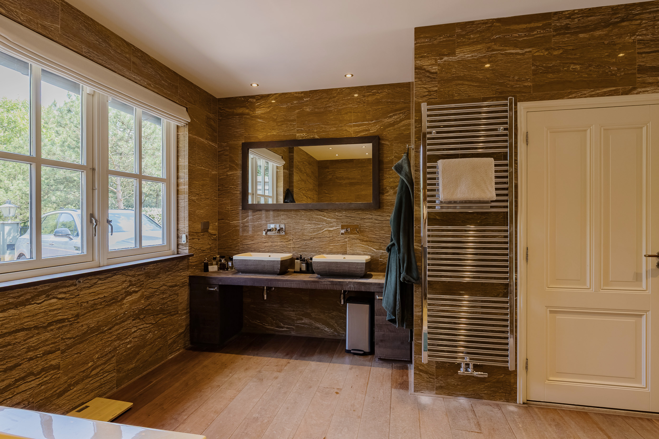 На первом этаже — тёплый ореховый паркет и индивидуальный холл, который ведёт в деревенскую кухню цвета зелёной липы с плитой AGA на шесть конфорок и четырьмя духовками. Гостиная оборудована камином и французскими дверями в сад. Приватная спальная зона образует отдельное крыло с мраморной ванной комнатой, душем с прямым входом, парной и умывальниками, выполненными на заказ из кожи. Здесь же — выход на веранду площадью 14 м², где единство внутреннего и наружного пространств достигается благодаря обогревателям и мягкой подсветке.
