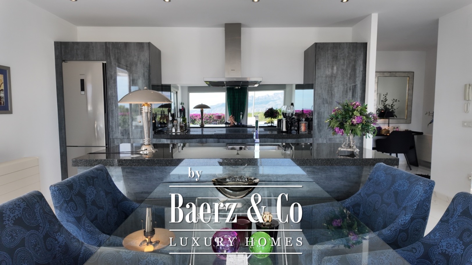 Вилла раскрывает своё предназначение через просторную зону гостиной и столовой открытой планировки, плавно переходящую в дизайнерскую кухню с центральным островом. Из двух спален главная представляет собой отдельный люкс с гардеробной, ванной комнатой и индивидуальным выходом на террасу. Панорамное остекление наполняет каждый угол светом и связывает интерьер с природой.