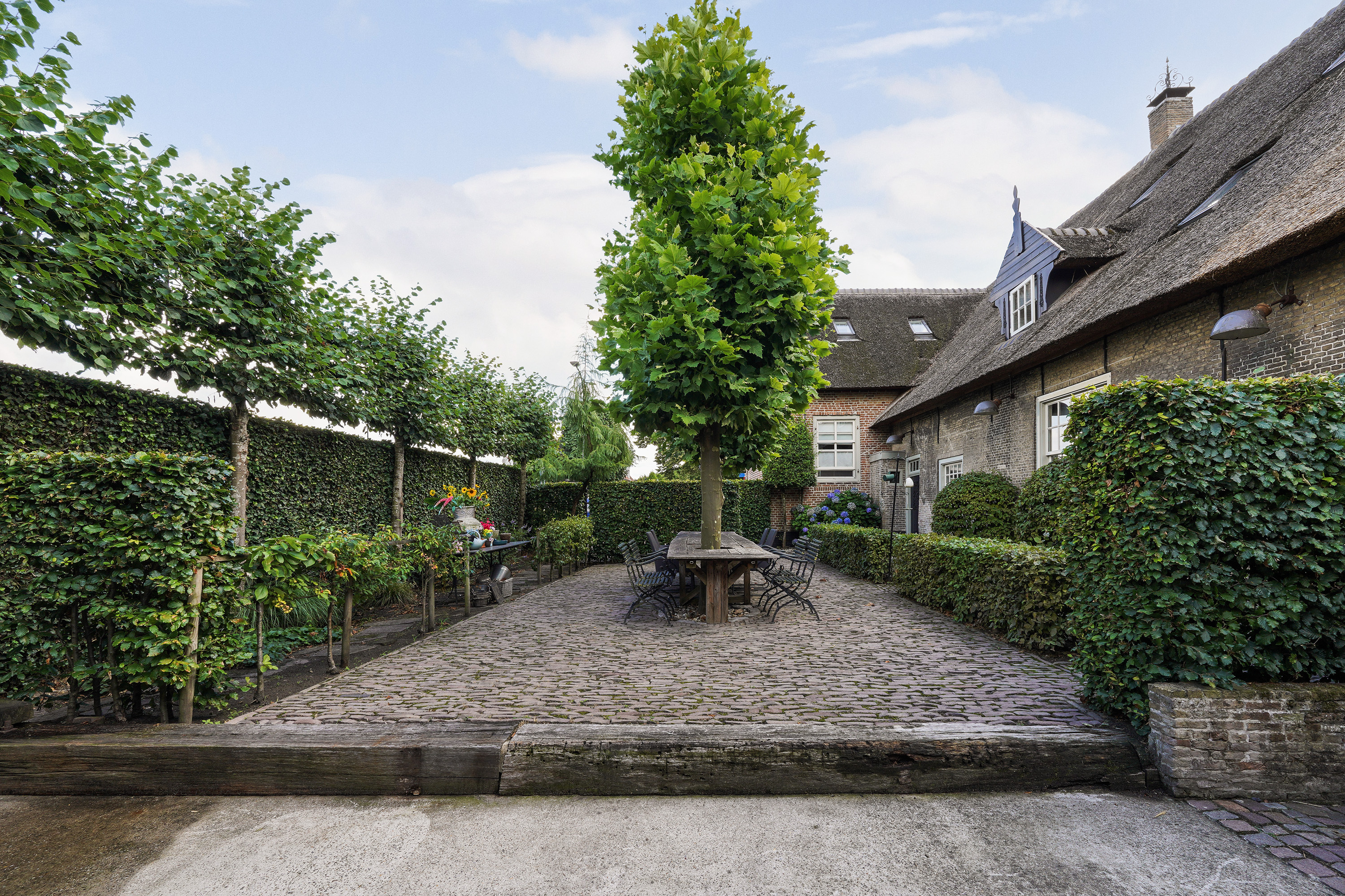 Наследственный дом в Sprang-Capelle сочетает историю с продуманной реновацией, предлагая редкую жилую площадь в 420 м² на участке 658 м². Этот национальный памятник архитектуры отличается выдающейся историей: деревянные балки, сводчатые потолки и величественные пространства переносят к истокам XVII века. Главная гостиная площадью почти 90 м² оборудована печью на гранулах и залита светом высоких окон; объёмы смягчают белая штукатурка и деревянные полы. Сердце дома — индивидуальная кухня, созданная в 2024 году с авторской мебелью от Ecker Interieurbouw и достаточным пространством для трапез, встреч и неспешного созерцания сада.