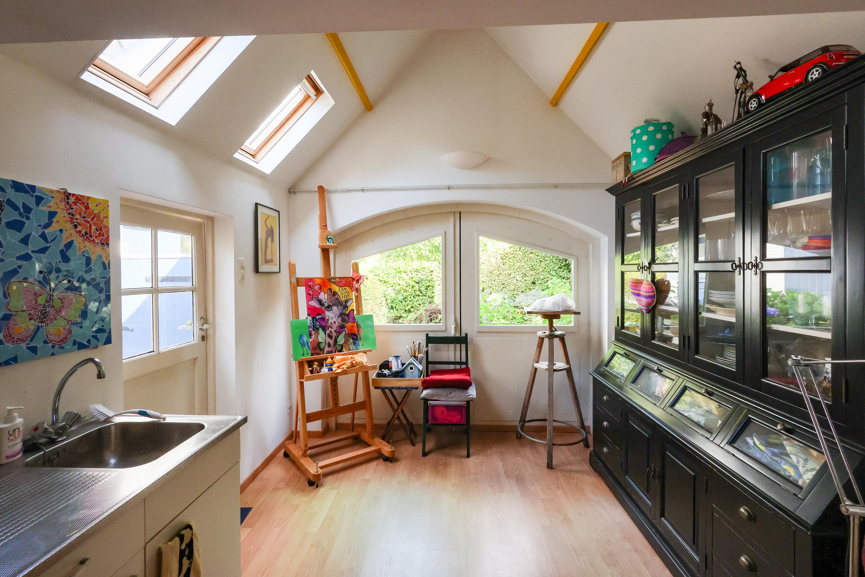 楼上的主人套房设有拱形天花板和阳台,另有两间卧室、一间书房,以及带地暖、步入式淋浴和蒸汽房的现代浴室。前车库已改建为16平方米的独立工作室,提供带有暖气、充足采光的工作空间,并配备水电。