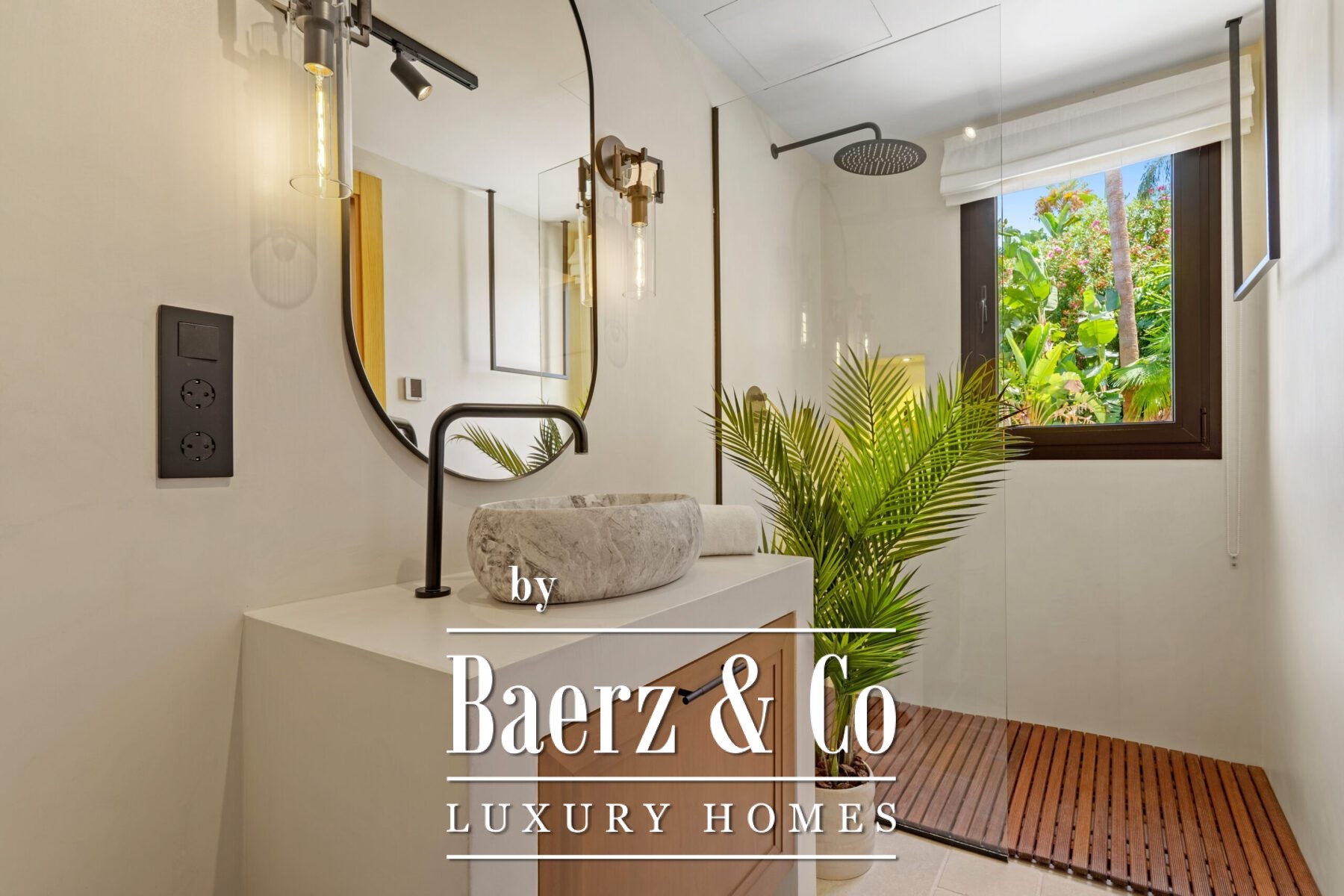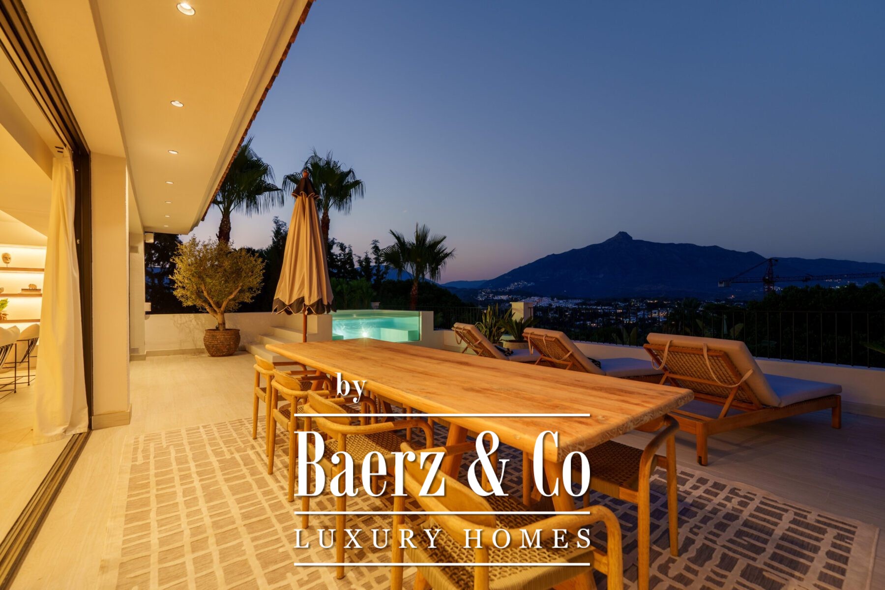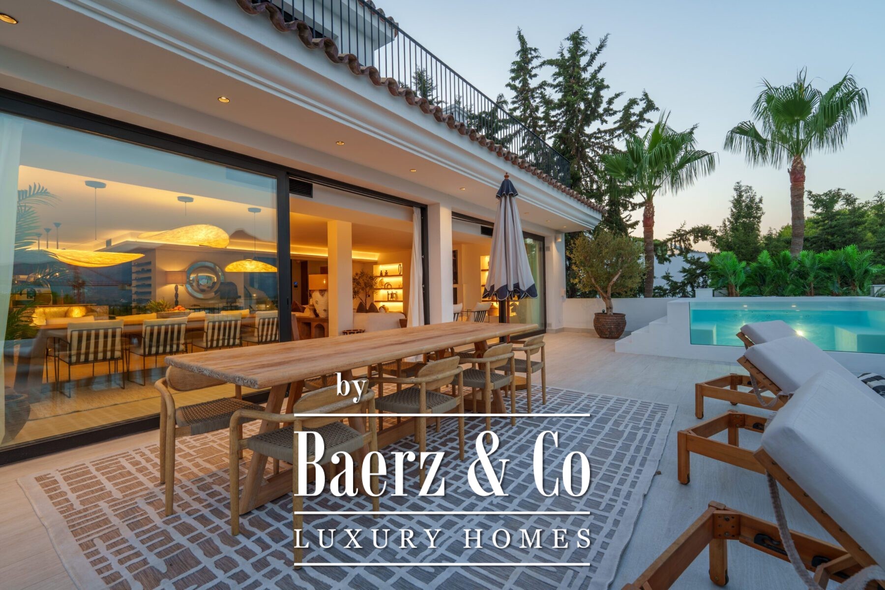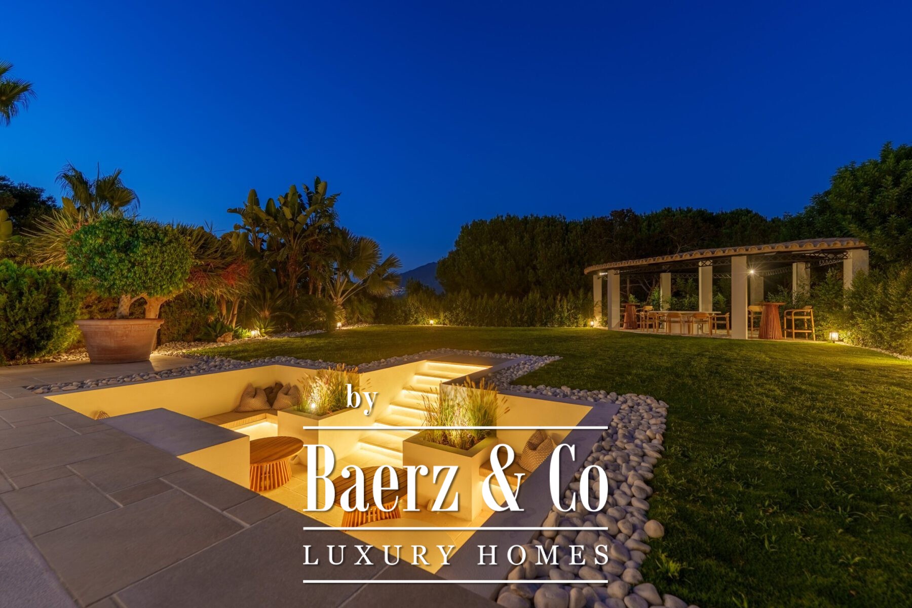 室外景观花园环绕私人泳池与下沉式休闲区,氛围灯光及遮阴空间适合静心冥想或社交聚会。多车位车库、安全系统,以及邻近高尔夫球场、海滩、Puerto Banús及马贝拉各类设施,使整体配套更加完善。