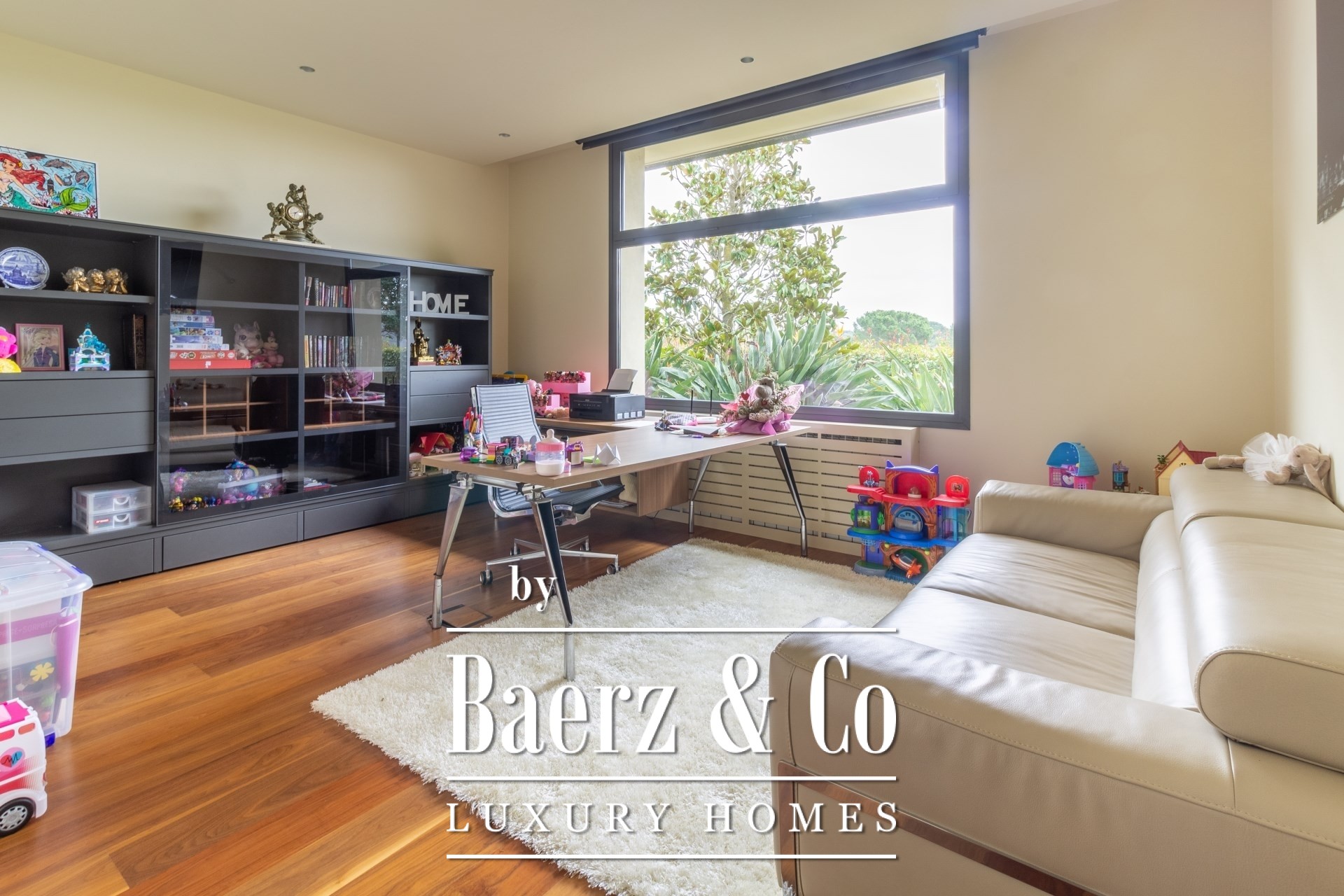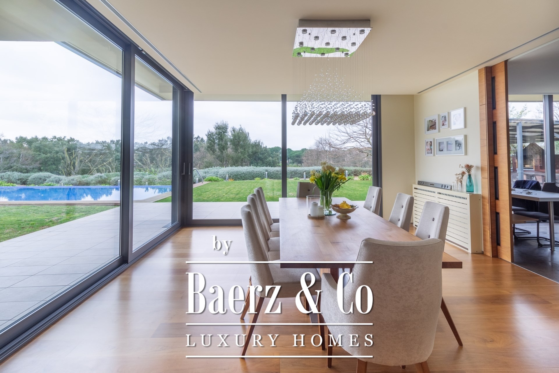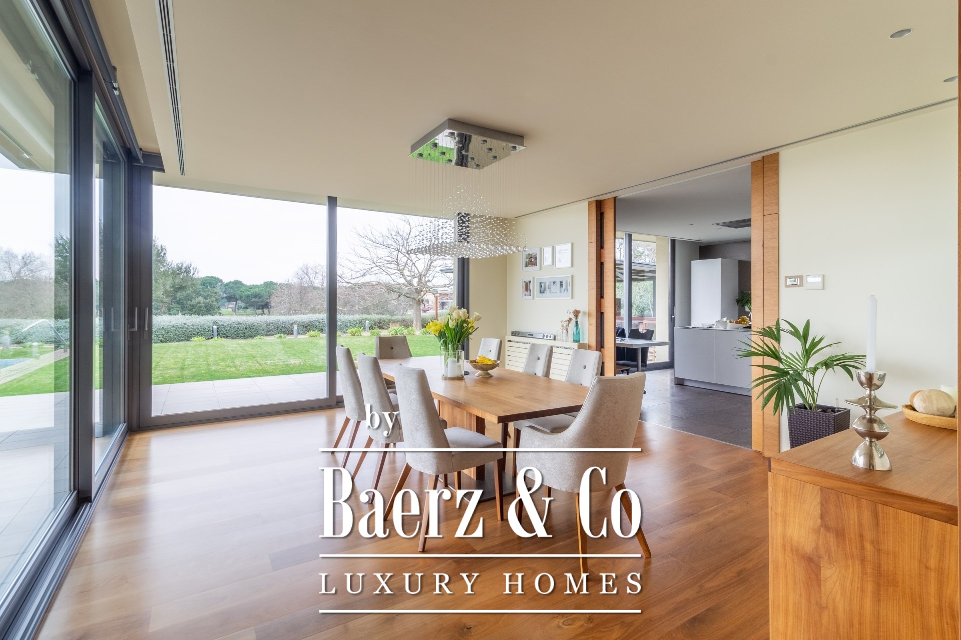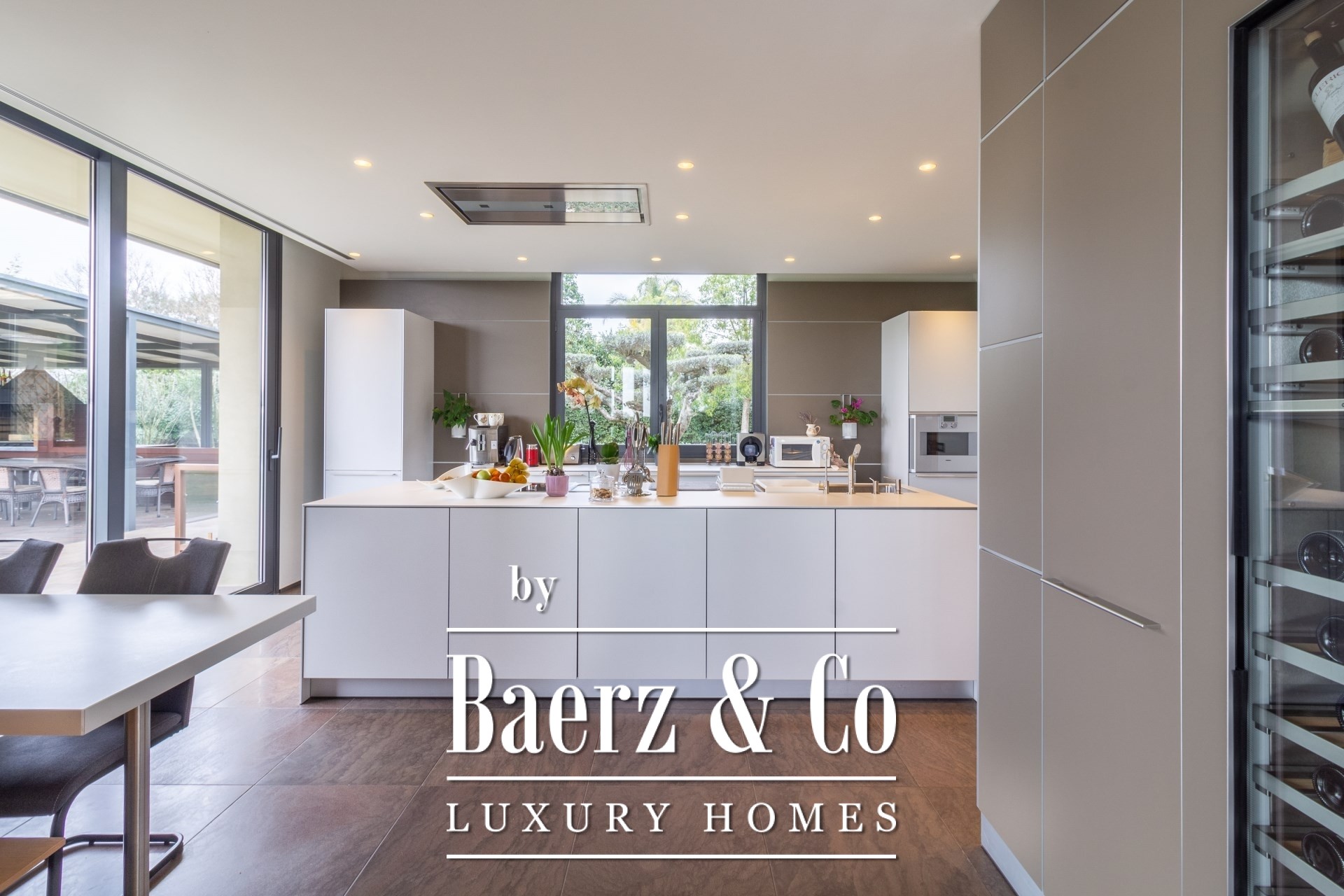 宽敞的玄关引入主层,宽阔的客餐厅沐浴在天然采光中,花园与泳池的开阔视野尽收眼底。带壁炉的阅读角为静谧思考营造氛围。厨房配备高端电器与卓越工艺,专为烹饪精致美食而设计。底层设有两间套房卧室,兼顾私密与便捷,并配有客用卫浴和独立办公室。