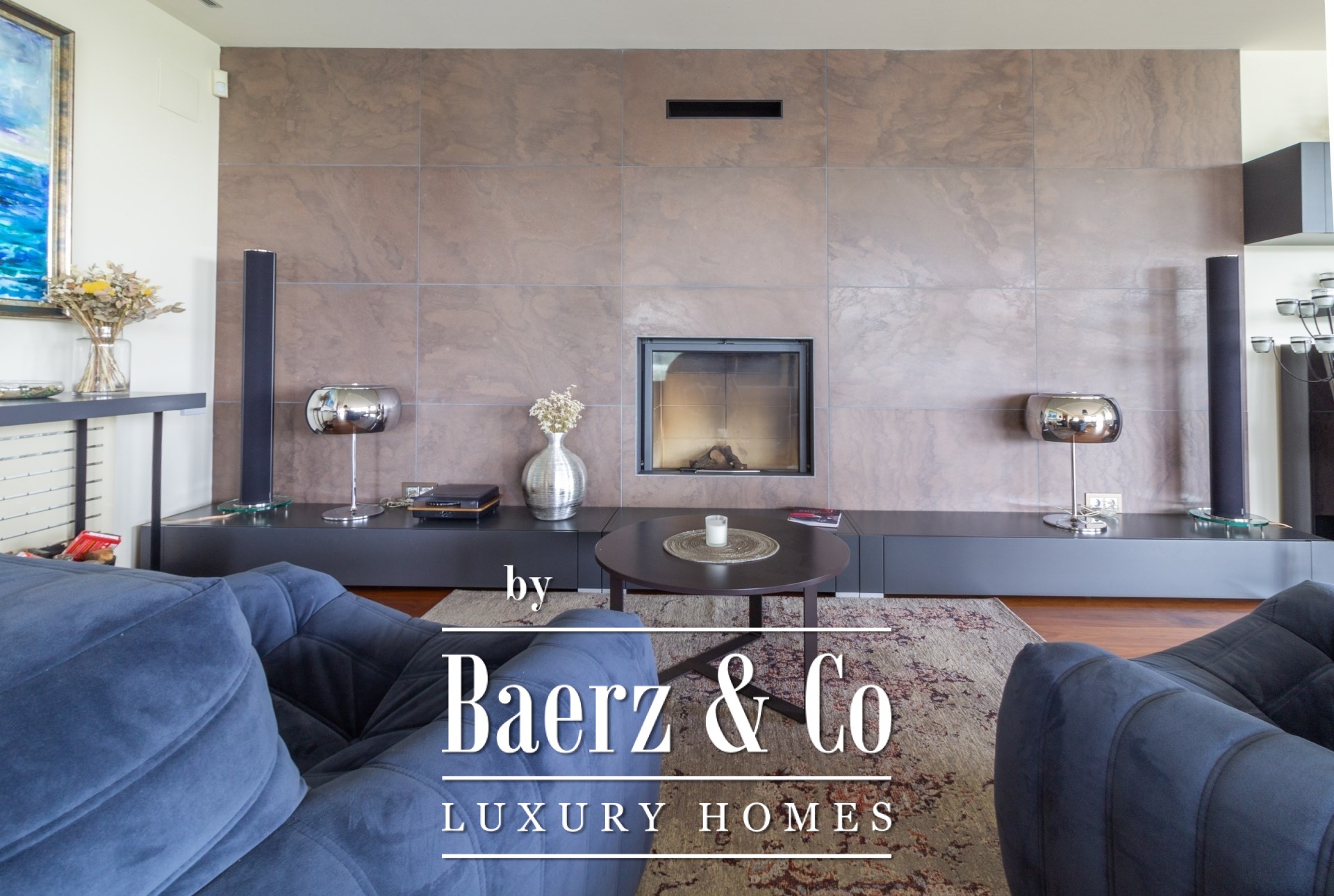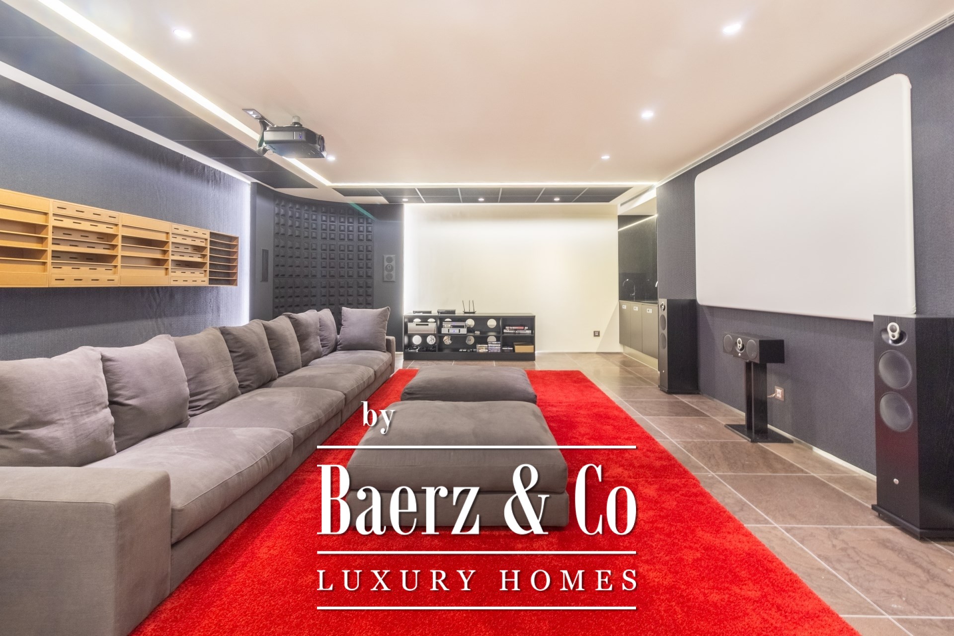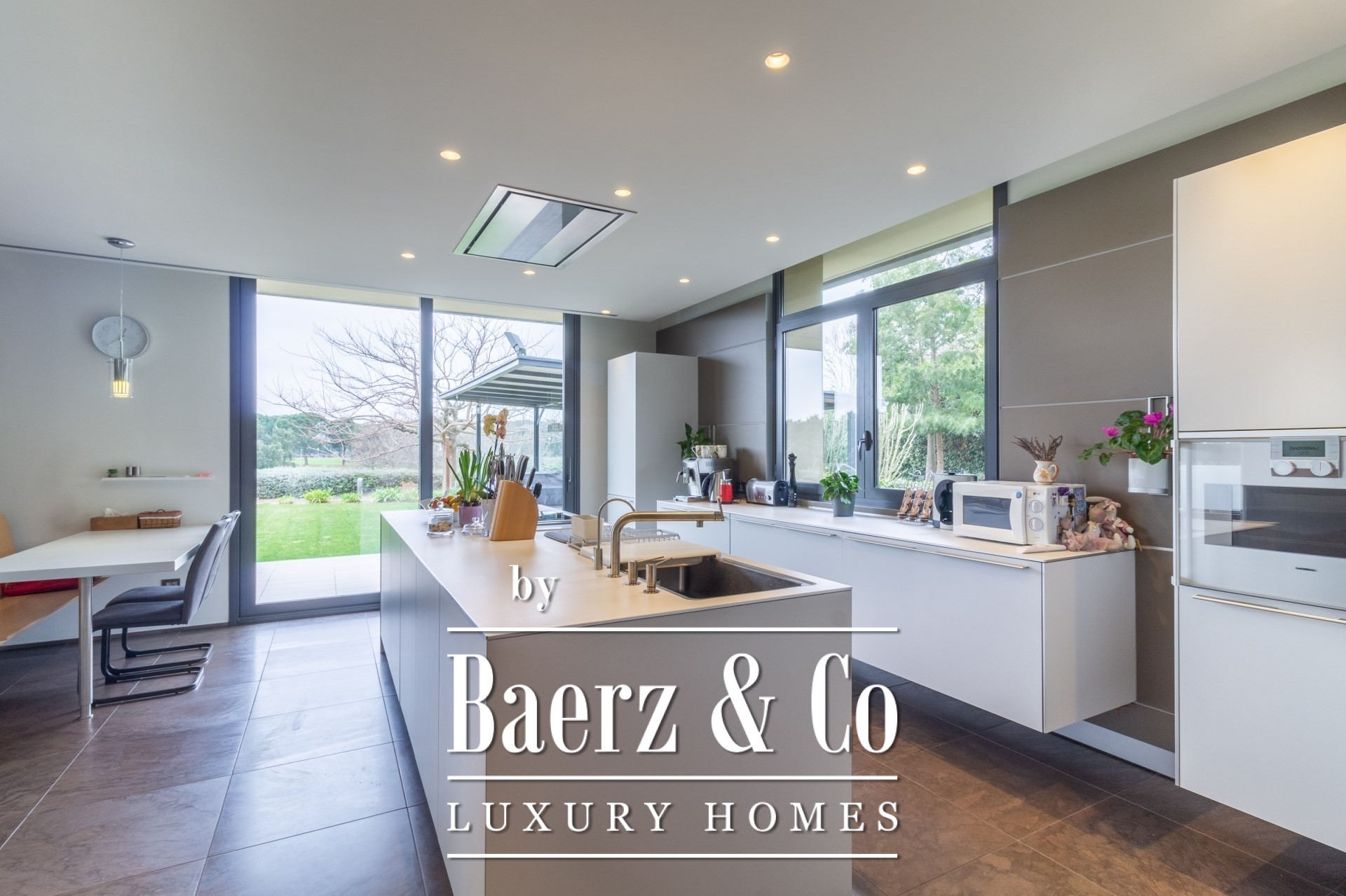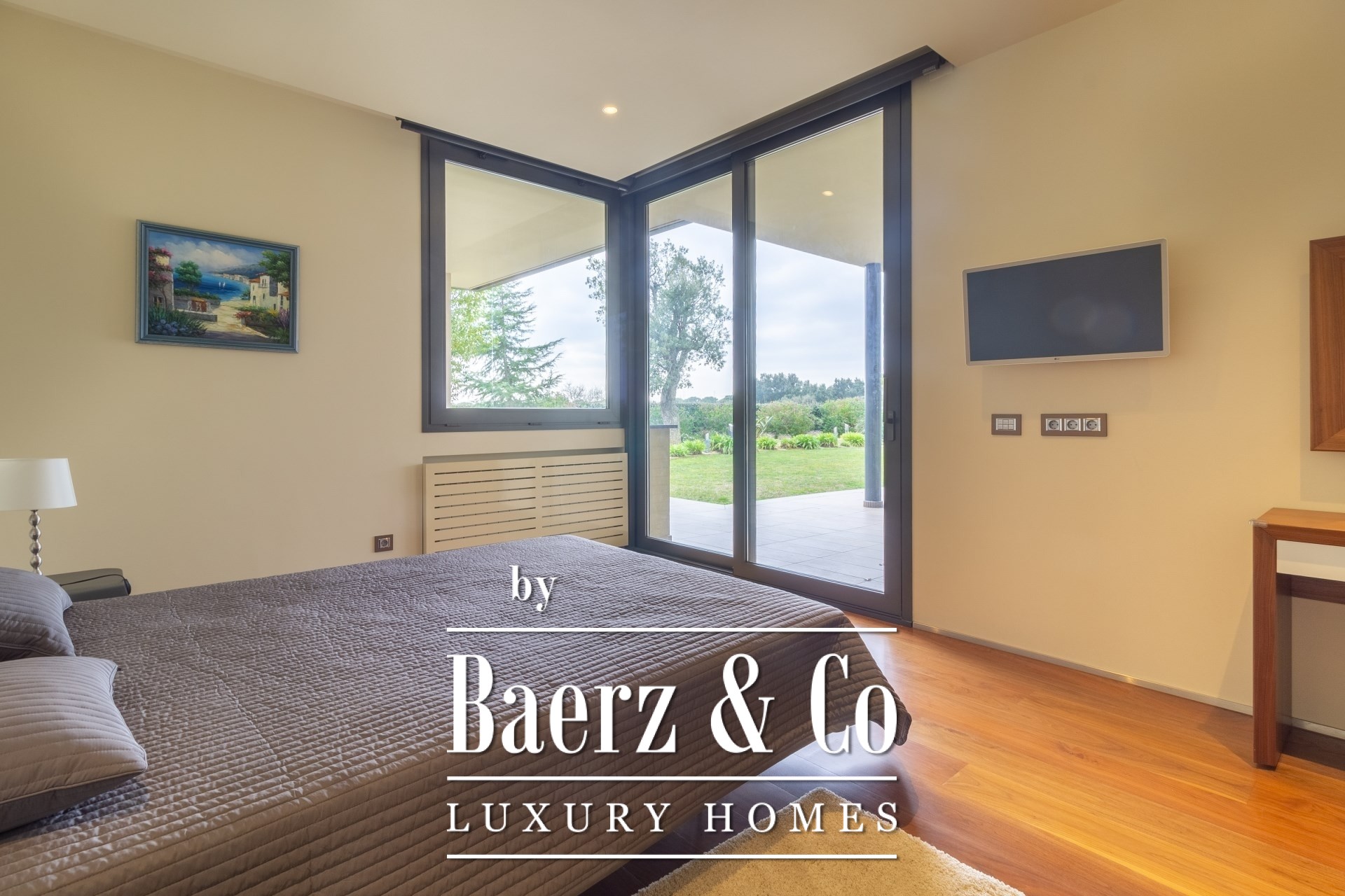 宽敞的玄关引入主层,宽阔的客餐厅沐浴在天然采光中,花园与泳池的开阔视野尽收眼底。带壁炉的阅读角为静谧思考营造氛围。厨房配备高端电器与卓越工艺,专为烹饪精致美食而设计。底层设有两间套房卧室,兼顾私密与便捷,并配有客用卫浴和独立办公室。